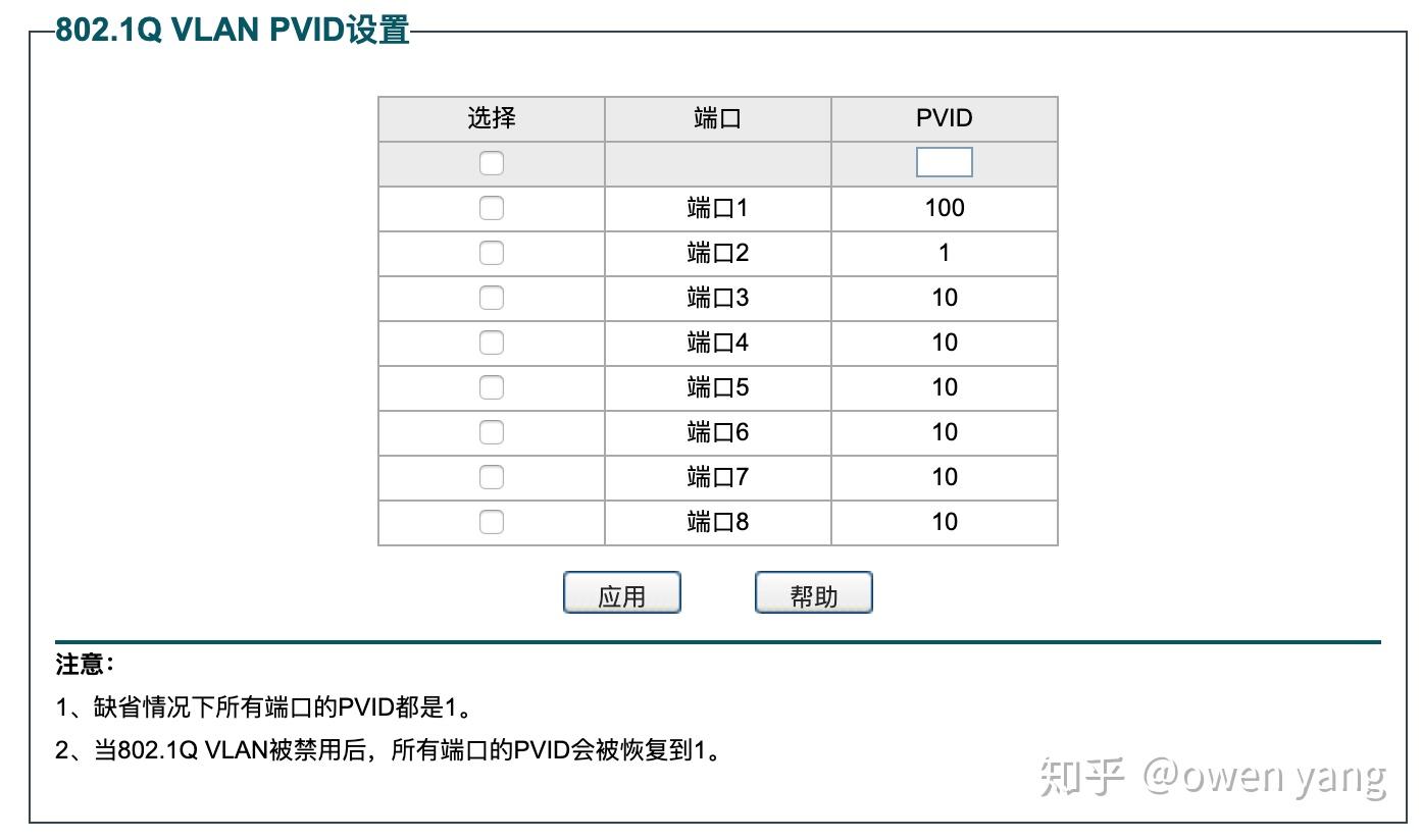 然后为每个端口设置PVID,其作用是为所有不带标签的VLAN数据流进来时打上标签。